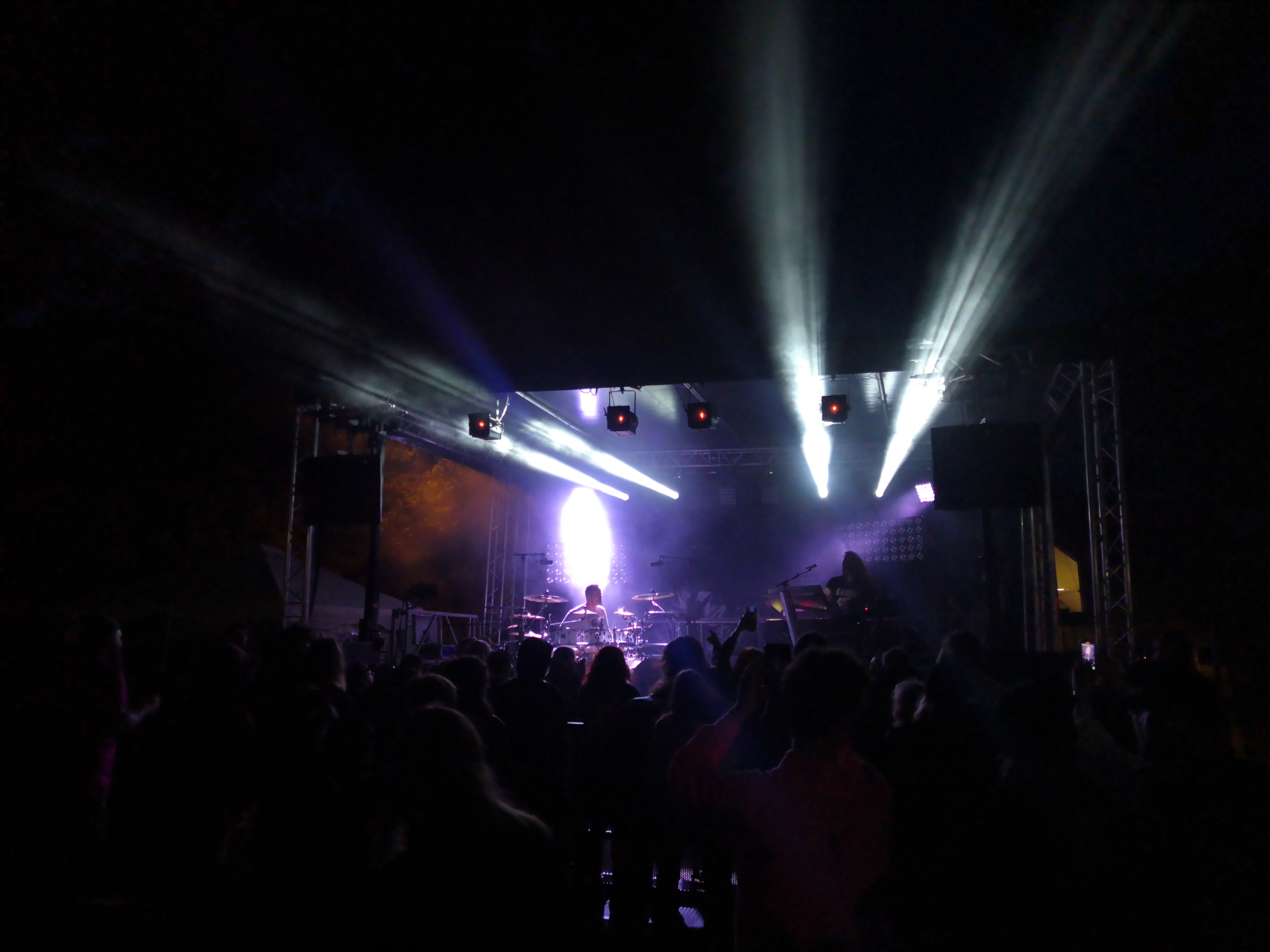Dernier concert. Nous avons un peu mal au dos, aux pieds. Le vent qui rafraichissait est devenu froid, l'humidité du lac tout proche n'aidant pas. Nous sommes restés écouter Shaârghot depuis un banc au fond du site avec une belle vue sur la scène. C'est de l'indus un peu énervé, pas vraiment ce que j'avais envie d'entendre à ce moment-là. Ni jamais en fait, je commence à me dire que le seul groupe de metal industriel que j'aime bien est Rob Zombie... Reste que ça avait l'air intéressant visuellement.